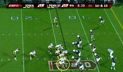 Most team's only bring in extra linemen during goal-line and short yardage situation. Not Iowa. This package was used through out...1 and 10, no problem. In the 4th quarter KOK called 16 straight runs and not a single pass. The Hawkeyes ran for 61 in the quarter and scored 10 points on offense (also 6 off of Clayborn's blocked punt return). They also owned the time of possession limiting Penn State's chances. In the 4th quarter, Iowa controlled the ball for 9:02.